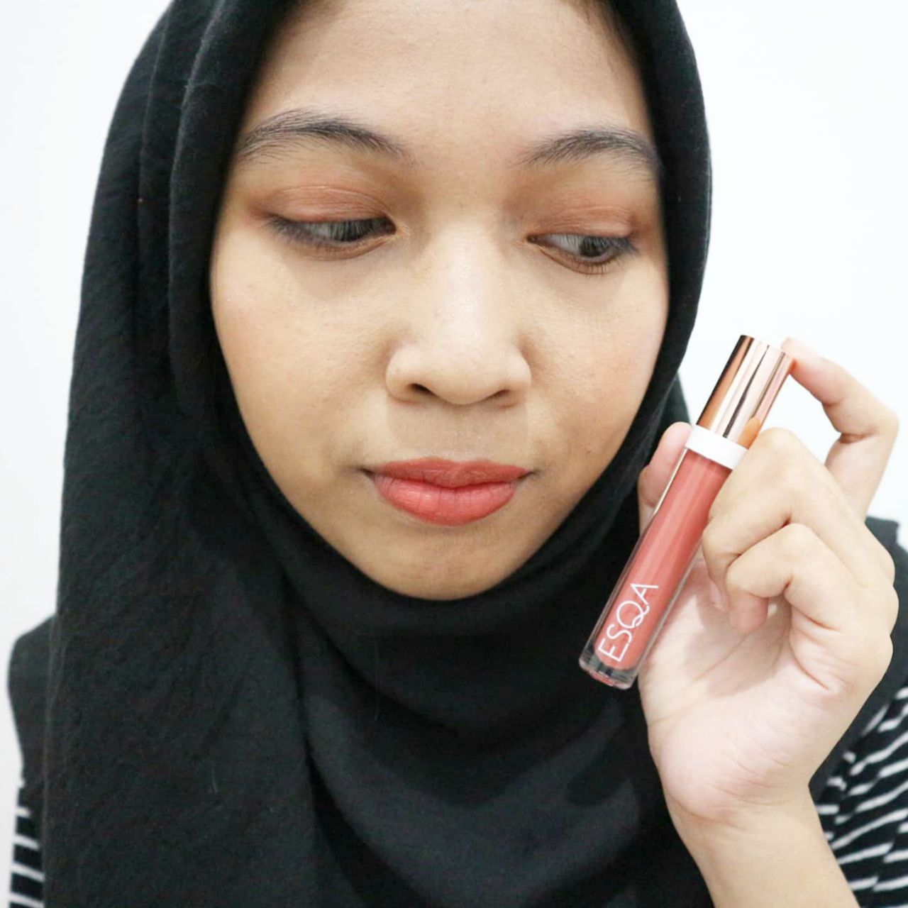 Lip Liquid Esqa Cosmetics ini menurutku sama dengan Lipcream hanya namanya saja yang beda. Pada packaging kertas/dusnya terdapat label halal dari MUI. Lalu packaging Lip Liquid Esqa ini berbahan sejenis kaca bening dan tutupnya sejenis plastik berwarna keemasan. Shade yang aku punya yang Peachy Pop warnanya peach dan ada unsur merahnya. Cara pemakaiannya dioleskan saja tanpa menekan bibir atas dan bawah. Teksturnya ringan, lembut, dan creamy. Warnanya pigmented dan bisa menutup warna bibir yang gelap. Hasilnya matte tapi tidak membuat bibir kering. Lip Liquid Esqa ini ngesetnya atau keringnya agak lama jadi kita harus diamkan dulu agar tidak pudar dan tranfer ke mana-mana. Setelah Lip Liquid Esqa kering hasilnya matte dan terasa ringan. Dibanding Lipcream yang lain Lip Liquid Esqa ini lebih mudah tranfer jadi tidak terlalu tahan lama. Agar Lip Liquid Esqa lebih tahan lama sebaiknya hindari makanan berminyak.